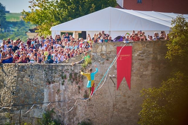 Postarat se co nejlépe o každého návštěvníka, který za námi váží cestu, tak vnímám vinobraní, které s kolegy každý rok na druhý zářijový víkend připravujeme. Letos nás čekalo několik výzev. Vedle programu na 13 scénách jsme zařadili nový bod programu – funambules, během kterého se provazochodci v historickém centru postarali o neskutečnou podívanou,“ uvedl František Koudela, ředitel pořádající Znojemské Besedy, který si pochvaloval i premiéru nové představitelky královny, herečky Marty Dancingerové.
