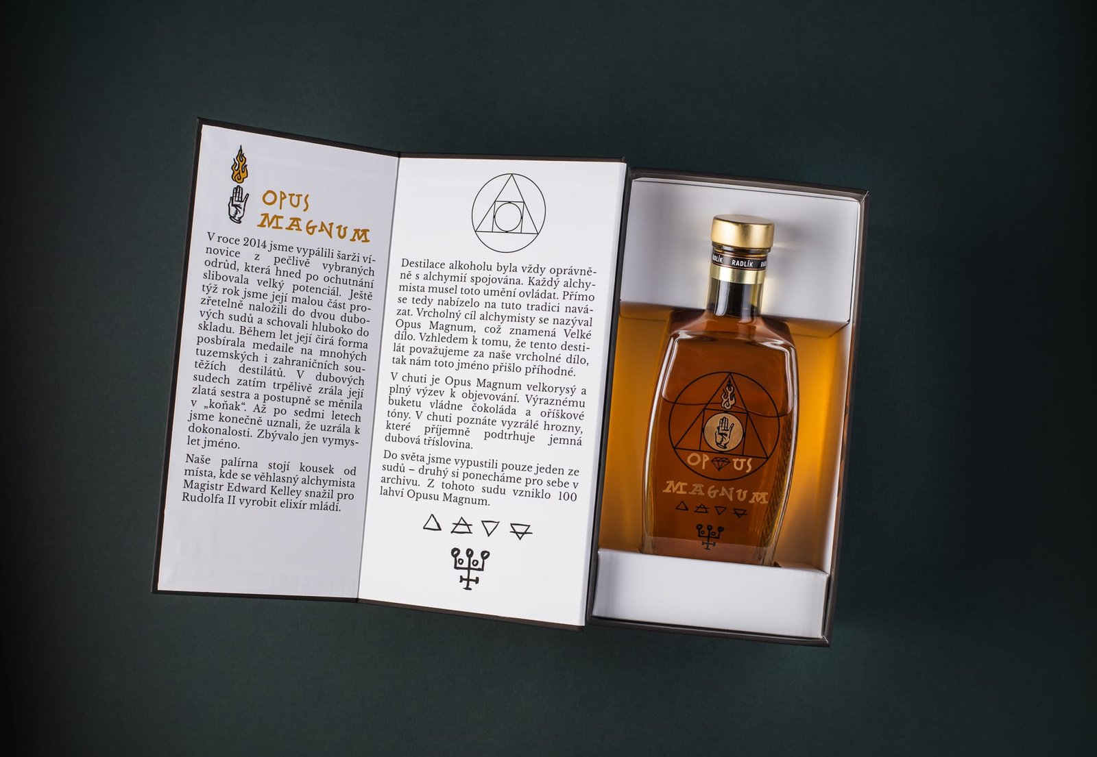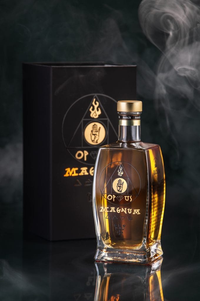 Brandy dostala jméno Opus Magnum: jednak díky své specifické zlatavé barvě, jednak na počest díla alchymisty Edwarda Kelleyho, který kdysi v Jílovém u Prahy kousek od Radlíku hledal jinou dokonalou formu: Kámen mudrců, čili proměnu běžných kovů ve zlato… což není tak daleko od umění destilatérství.