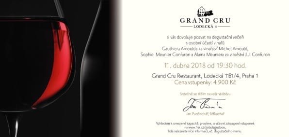 Hosté večera proto jistě ocení nejen zajímavou nabídku, ale i ojedinělou možnost j setkat se s řadou vinařů a také objednat si na místě vína En Primeur, tedy ještě před uvedením na trh. Těšit se dále mohou na řízené speciální degustace, stejně jako na osobní setkání například s Gauthierem Arnouldem z vinařství Michel Arnould či se Sophií Meunier Confuron a Alainem Meunierem z vinařství J. J. Confuron. Ti budou přítomni i na galavečeři ve vyhlášené restauraci Grand Cru, která akci ve stejný den, od 19,30 hodin, završí. Na hosty čeká speciálně připravené degustační menu od šéfkuchaře Jana Punčocháře, které doplní vína právě z těchto dvou vinařství.