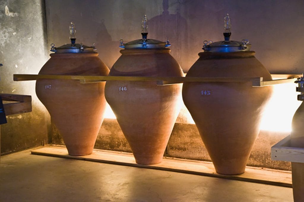 Ta se i ve sklepě rodí s respektem k surovině. Novinkou jsou betonové tanky, instalované minulý rok, v nichž část vín kvasí, které se přidaly ke starým i novým sudům a hlavně k terakotovým amforám, které zaplňují plochu celého sklepa.