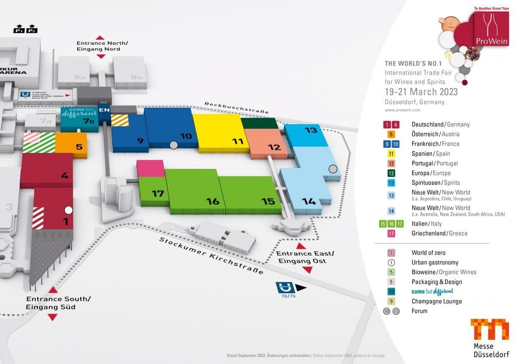 Produktové řady z různých zemí jsou do jednotlivých hal rozděleny následujícím způsobem: Argentina, Chile, Uruguay a další zámoří (národy Nového světa) haly 13 a 14, Austrálie, Kalifornie, Jižní Afrika a další zámoří (národy Nového světa) hala 14, Německo haly 1 a 4, Francie: haly 9 a 10, Řecko hala 17, Itálie haly 15, 16 a 17, Japonsko hala 14, střední a východní Evropa hala 12, Rakousko hala 5, východní Evropa a zbytek Evropy hala 12, Portugalsko hala 12, Španělsko hala 11, Destiláty hala 13, Trendshow „stejné, ale odlišné“ hala 7.0.