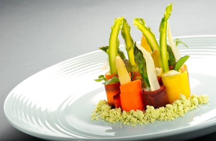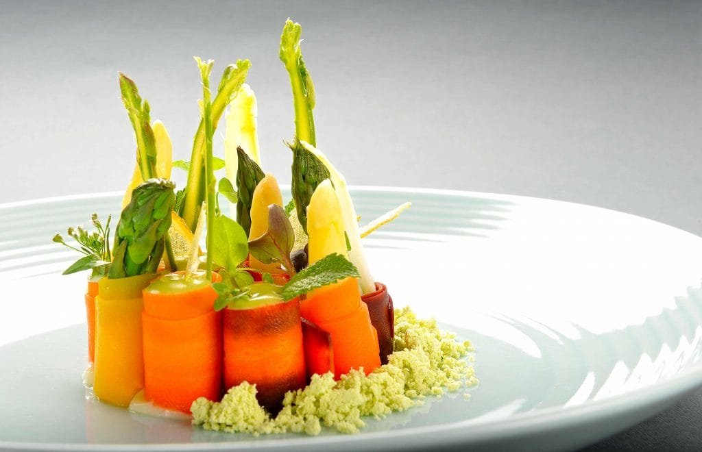 Z plátků karotky vymotáme přes prst ruličky a plníme je pomocí cukrářského pytlíku hmotou pyré, proléváme je střídavě dresinkem. Přidáme chřestové špičky a plátky, pokapeme limetovou šťávou, zdobíme sezónními bylinkami a mátovým prachem.