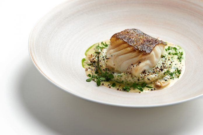 Pečená treska s tapiokou, květákovým pyré a omáčkou beurre blanc se srdcovkami.