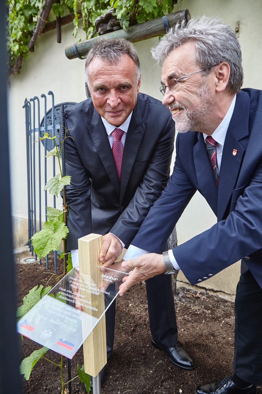 A protože vedle nedávno zasazené Staré Trty se na Pražském hradě daří i naší révě, její odnož putovala minulý týden na oplátku do Mariboru. V pátek 25. května zde zasadili zahradníci hradu poblíž nejstarší révy světa český keř odrůdy Hibernal, pocházející z Plečnikovy hradní vinice. I to je vzácnost, dvě stovky zdejších keřů rodí základ pro víno značky Pražský hrad, které se používá jako protokolární dar pro významné návštěvy.
