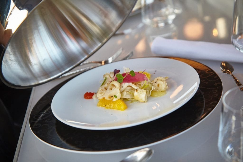 Jak vlastně večeře či oběd v oblacích probíhá? Dvaadvacet hostů usedne kolem prostorného stolu na speciální pohodlná křesla, ke kterým je každý připásán bezpečnostními pásy. Poté je plošina vyzdvižena do vzduchu, kde šéfkuchař servíruje buď tříchodový oběd nebo o jeden chod bohatší večeři. K tomu se podává sklenka bublinek a posléze bílého či červeného vína. Oběd v oblacích stojí 2190 korun, za večeři hosté zaplatí 3380 korun. Výjimečným zážitkem je večeře při západu slunce, která stojí od 4190 korun až 5490 korun.