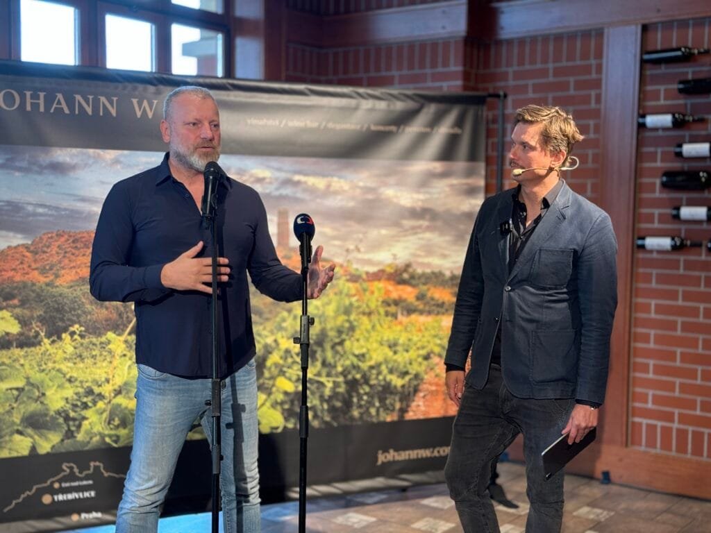 Zakladatel a majitel vinařství Jan Dienstl (vlevo) a moderátor akce, herec Tomáš Měcháček