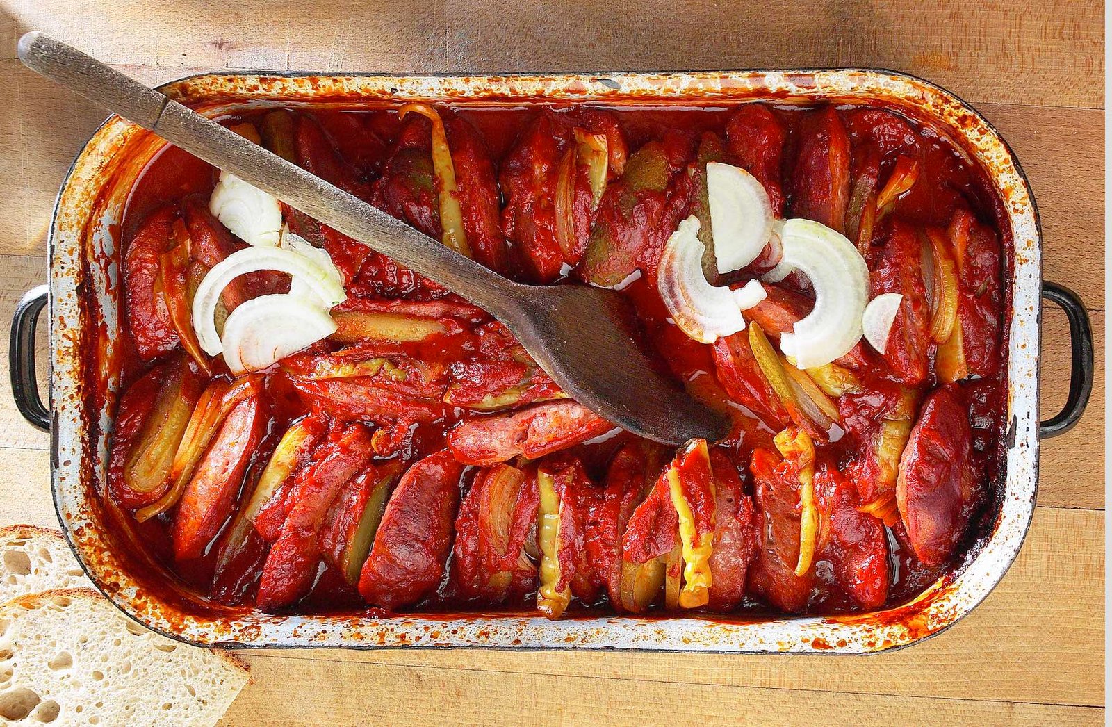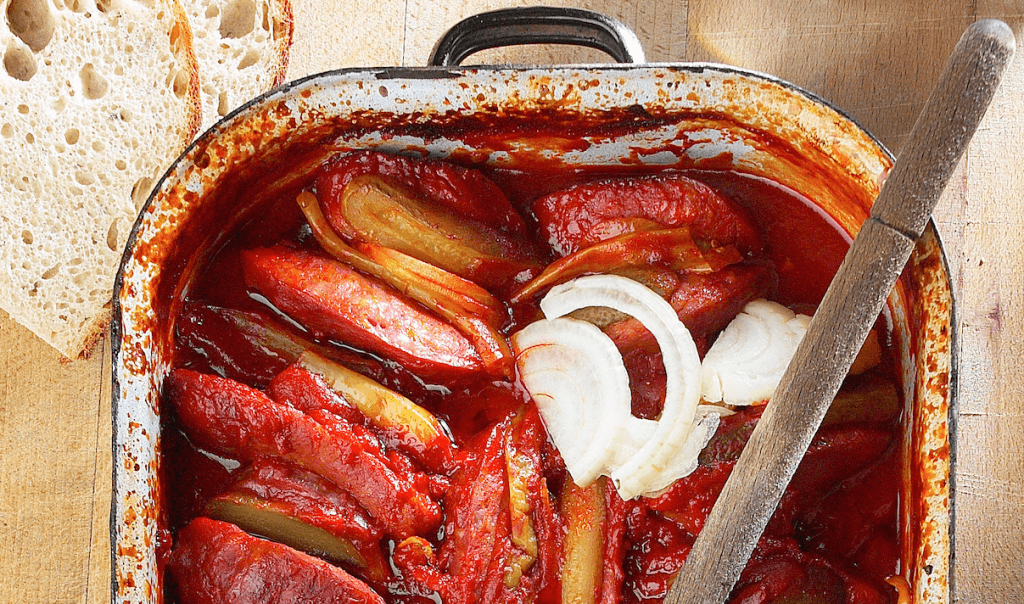 Postup: Špekáčky nařízneme podélně, ale nedokrojíme, abychom do nich mohli vložit později náplň, naskládáme je do pekáčku a předpečeme je v troubě vyhřáté na 180 °C. Mezi tím si připravíme zeleninu – cibuli nakrájíme na proužky, česnek nasekáme nahrubo, nakládanou zeleninu pokrájíme na kousky tak, aby se ideálně vkládala do uzenek. Asi po 20 minutách špekáčky vyndáme z trouby, můžeme slít tuk, naplníme je zeleninou, zasypeme zbylou cibulí a nahrubo pokrájeným česnekem, případně nasekanou chili papričkou. Pak smícháme pivo s rajčaty a kořením a vše zalijeme, směsí. Překryjeme alobalem a dáme zhruba na hodinu do trouby dopéct, hlídáme, aby se nic nepřipalovalo, cibule by měla krásně zkaramelizovat, omáčka zhoustnout. Na posledních 20 minut alobal sundáme a pečeme je odkryté. Podáváme s čerstvým chlebem a skleničkou piva.