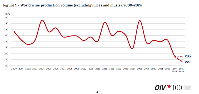 Jak ukázala data z roku 2023, vinohradnictví a vinařství po celém světě právě v této době čelí zásadním výzvám. Plocha vinic je stále menší (o 0,5 % oproti roku 2022), produkce dosáhla historických minimálních hodnot od roku 1961 (pokles o 10 % na 237 milionů hektolitrů) a spotřeba vína klesá už od roku 2018 (o 2,6 % v roce 2023 ).