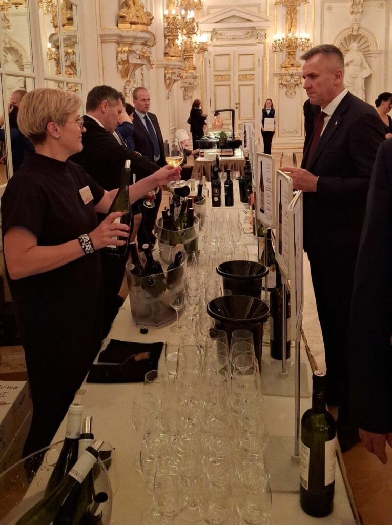 Vinný lístek na slavnostní recepci na Pražském hradě zahrnoval: Veltlínské zelené 2023, pozdní sběr, z Vinařství MERLON. Dále Rulandské bílé 2023, pozdní sběr, ze Zámeckého vinařství Bzenec. Ryzlink vlašský 2022, výběr z hroznů, z Vinofolu . Ryzlink rýnský 2019 tentokrát z oblasti Čechy a to pozdní sběr, ze Školního statku Středočeského kraje. Zpestřením byl Cabernet blanc 2023, pozdní sběr, z Vinařství Štěpán Maňák. Z řady aromatických vín nechyběla Pálava 2023, pozdní sběr, z Rodinného vinařství Skoupil. Milovníci růžových vín si vychutnali Rosé Frankovku 2023, VOC, od Víta Sedláčka. Z červených vín se podávalo Rulandské modré 2022, z Vinařství Svoboda. Dále Frankovka 2022, pozdní sběr, z THAYA vinařství. Výběr uzavíralo Cuvée 348 2022, pozdní sběr, z Vinařství Jan Plaček.