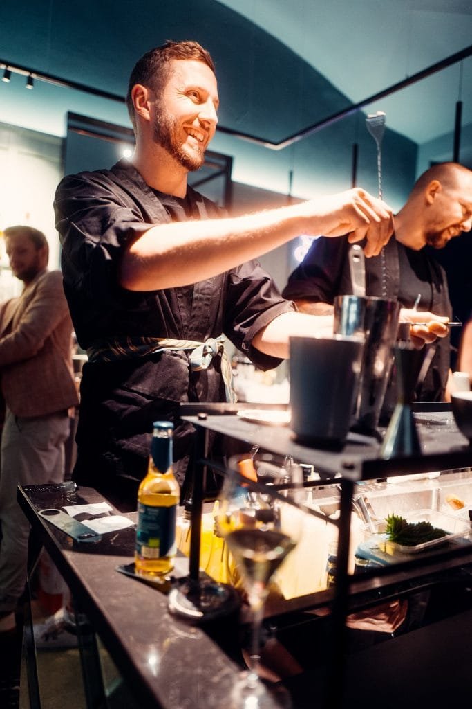 Pestré menu provází i pestrá nabídka drinků ve sklenkách chlazených dusíkem. Polovinu tvoří koktejly z prémiového ginu Monkey 47, které servírují tzv. prebatched. To znamená, že barman namíchá pečlivě drinky s předstihem a nechá je vychladit. „Výhodou je, že drink bude vždy chutnat stejně a dostanete ho pokaždé ve špičkové kvalitě, kouzlo míchání před hostem nahrazuje osobní dokončení každého drinku u speciálního chlazeného stolu. Naším záměrem je, aby si hosté drinky vybírali podle jednoduché chuťové charakteristiky, která je v menu znázorněna slovně a graficky,“ popisuje manažer baru Benedikt Houda, který stojí za vytvořením koktejlové nabídky s tropickou atmosférou v minimalistickém pojetí. Eleganci koktejlů pozdvihují asijské a neznámé suroviny, které u nás jen tak nenajdete, což dokládá například koktejl Mango Sticky Rice podávaný v mističce na sake, zdobený sezamem, rýžovou espumou a plátkem manga.