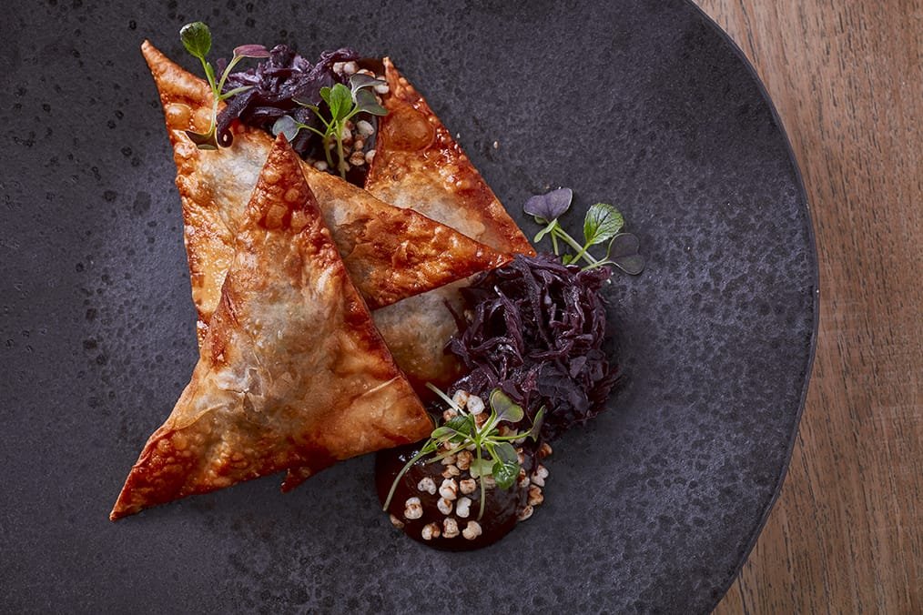 Grilované kachní prso, kroketa z brambor a kachního confitu, fenyklový kompot, Madeirová omáčka