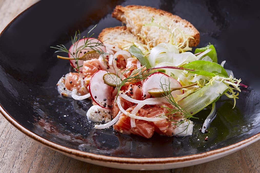 Losos Gravlax, křupavé bramborové rösti, avokádový krém, zauzený kaviár z lososovitého pstruha