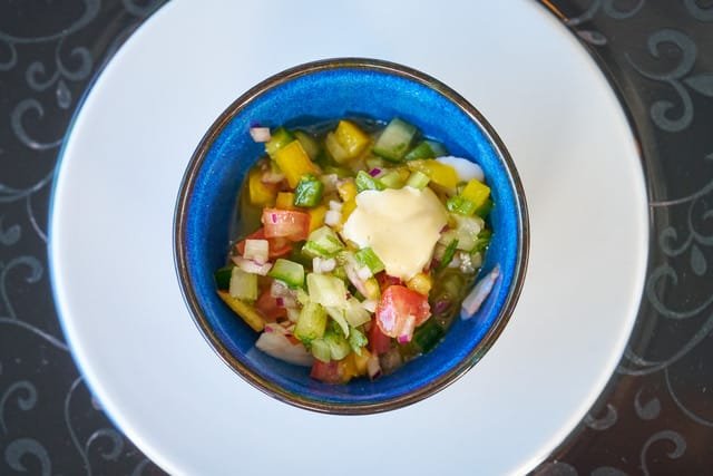 Letos v létě připravil menu na Večeři v oblacích, která se po přestávce vrátila v srpnu do Bratislavy. Nyní jej prezentuje v Praze. Liší jen v lokálně dostupných sezonních surovinách. Základ tvoří chutě babího léta.