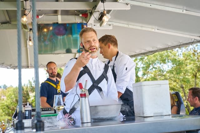 Případného strachu z výšky vás zbaví šampaňské před startem, bezpečnostní pásy v sedačkách a síť pod stolem a křesly. A taky kuchaři, servis a šéf letu, který dbá nejen na to, aby vše bylo báječné, ale také, aby řeč nestála. Odvážnější užívají hned, bojácní pomalu začínají dýchat příjemně usazení kolem stolu, v jehož středu připravuje šéfkuchař na dvou metrech čtverečních exkluzivní pokrmy. Ať už tříchodový oběd, čtyřchodovou večeři při západu slunce či pozdní večeři pod hvězdami, kořeněné adrenalinem jsou to nezapomenutelné chody.