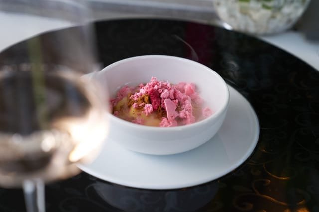 Následuje barevná, voňavá a překvapivá kulajda plná chutí, ozvláštněná špetkou libečku, pohankou a speciálně upraveným žloutkem. Hlavní chod představuje jemné telecí líčko s karamelizovaným jablkem a chipsy z topinamburu s lískovými oříšky. A k němu rakouský Grünner Veltliner Weissenkirchen Federspiel z Domäne Wachau ročníku 2023, který se sebevědomým ustojí i tenhle pokrm výraznější a bohatší chuti. Vegetariáni si pochutnají na ceviche z lilku a pečeném květáku se „spáleným“ jablkem a topinamburovými chipsy. Sladký závěr v podobě malinového crème brûlée s růžovým pepřem pak vystřelí do nebe nejenom ledovým dotykem máty, ale i tradiční „zakouřenou“ show.