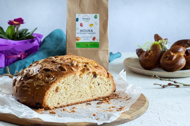 Tato mouka je vyladěná tak, aby v ní byl optimální poměr mouky celozrnné špaldové, pšeničné hladké a polohrubé. Celozrnná špaldová pro vlákninu, minerální látky, tuky z celého zrna špaldy. Ale pro náročnější pečení, jakým mazanec je, aby těsto dobře kynulo, drželo výšku pečiva a mělo dobrou strukturu i kyprost, jsou pak dodané mouky pšeničná hladká a polohrubá. Většinou se peče z celé bílé mouky, ale Probio se snaží uvádět recepty obohacené celozrnnou moukou, protože obecně máme málo vlákniny a mikroživin. A pokud tedy vybrat celozrnnou mouku, pak určitě kvalitnější špaldu, která je na živiny bohatší.