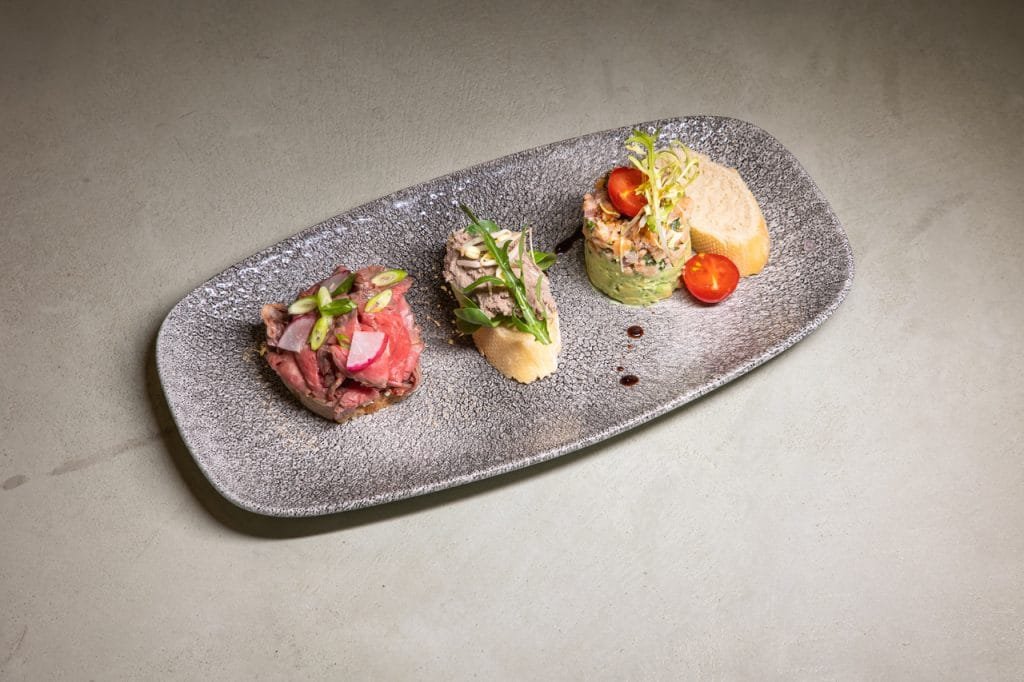 Ochutnávku ve vzdušném, vkusně, prakticky a zároveň designově zařízeném podniku se stylovými obrázky romantických pražských zákoutí začínáme samozřejmě přípitkem, příjemně suchým a již hezky nazrálým sektem Chateau Valtice, VOC, extra brut 2017, deci a půl za mírumilovných 89 Kč.. A také něčím malým na rozprouděním chuti. Tapas, nabízející příjemnou kombinaci různorodých soust se skládají ze sušeného masa a klobás, domácího tataráku s balsamikem, paštiky z kuřecích jater, příjemně jemné a zároveň pikantní. Kdo má rád ryby, jistě si užije tartar z marinovaného lososa doplněný avokádem. Následuje rostbíf z vyzrálého hovězího s domácí tatarkou a také velmi příjemně vychucený salát s pečenými krevetami, grepem a limetou.