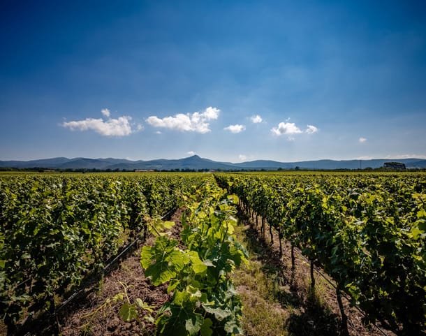 Vinice v Bolgheri, kde vznikají legendární vína Sassicaia, Ornellaia, Solaia nebo Tignanello. Tato vinice patří vinařství Tenuta Guado al Tasso rodiny Antinori