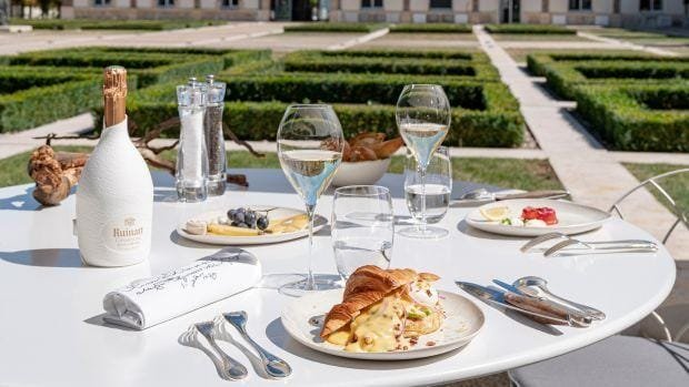 Gastronomické zážitky přímo ve vinařství jsou jednou z nejoblíbenějších součástí návštěv. Zde menu s klasikou Ruinart Blanc de Blancs.