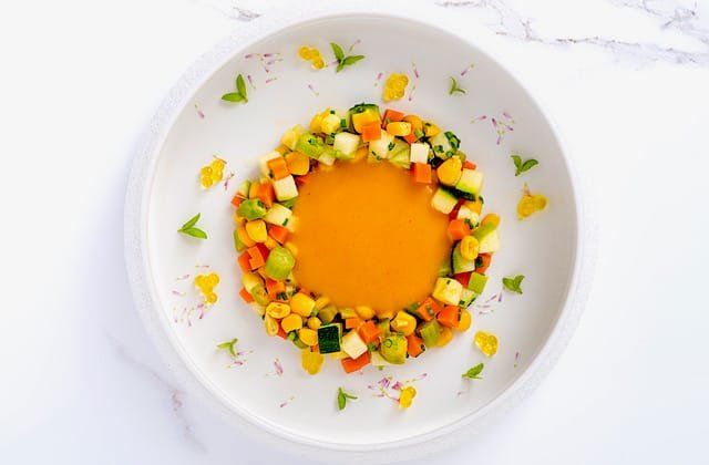 1 žlutý meloun (odrůdy cantaloupe), 50 g cukety, 1⁄2 mrkve, 3 lžíce bio kukuřice, 100 ml extra panenského olivového oleje, 10 g pažitky, 1 polévková lžíce bio jablečného octa, 1 limetka, 1⁄2 jablka nejlépe Golden Delicious, 3 nebo 4 lístky máty, mořská sůl podle chuti, jedlé květy na ozdobu